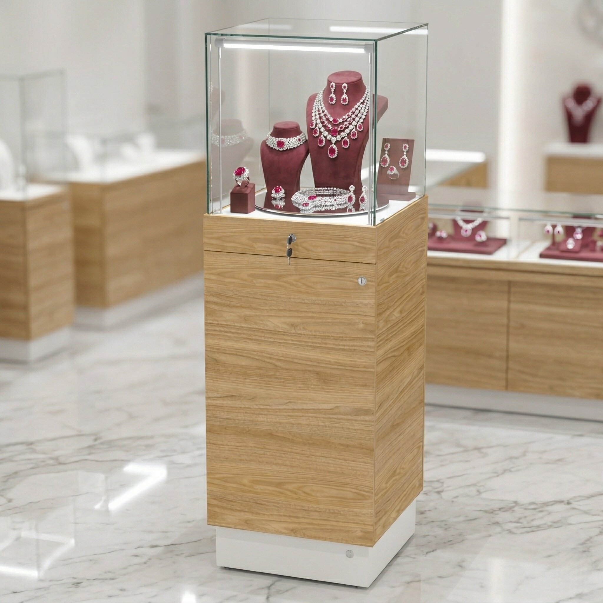 mechanizmu obrotowego (1 obr/min) z lustrzanym talerzem ekspozycyjnym, prezentowane przedmioty są widoczne z każdej strony, co skutecznie przyciąga uwagę klientów.