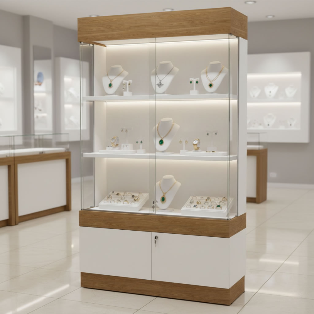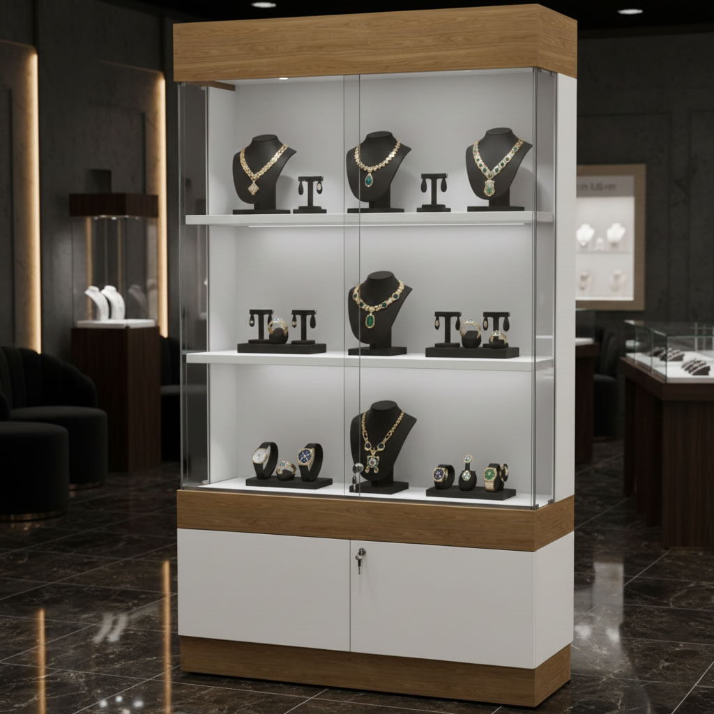 to profesjonalna, stojąca i zamykana witryna szklana zaprojektowana do bezpiecznej oraz efektownej ekspozycji biżuterii w salonach jubilerskich i przestrzeniach handlowych. Model o wymiarach