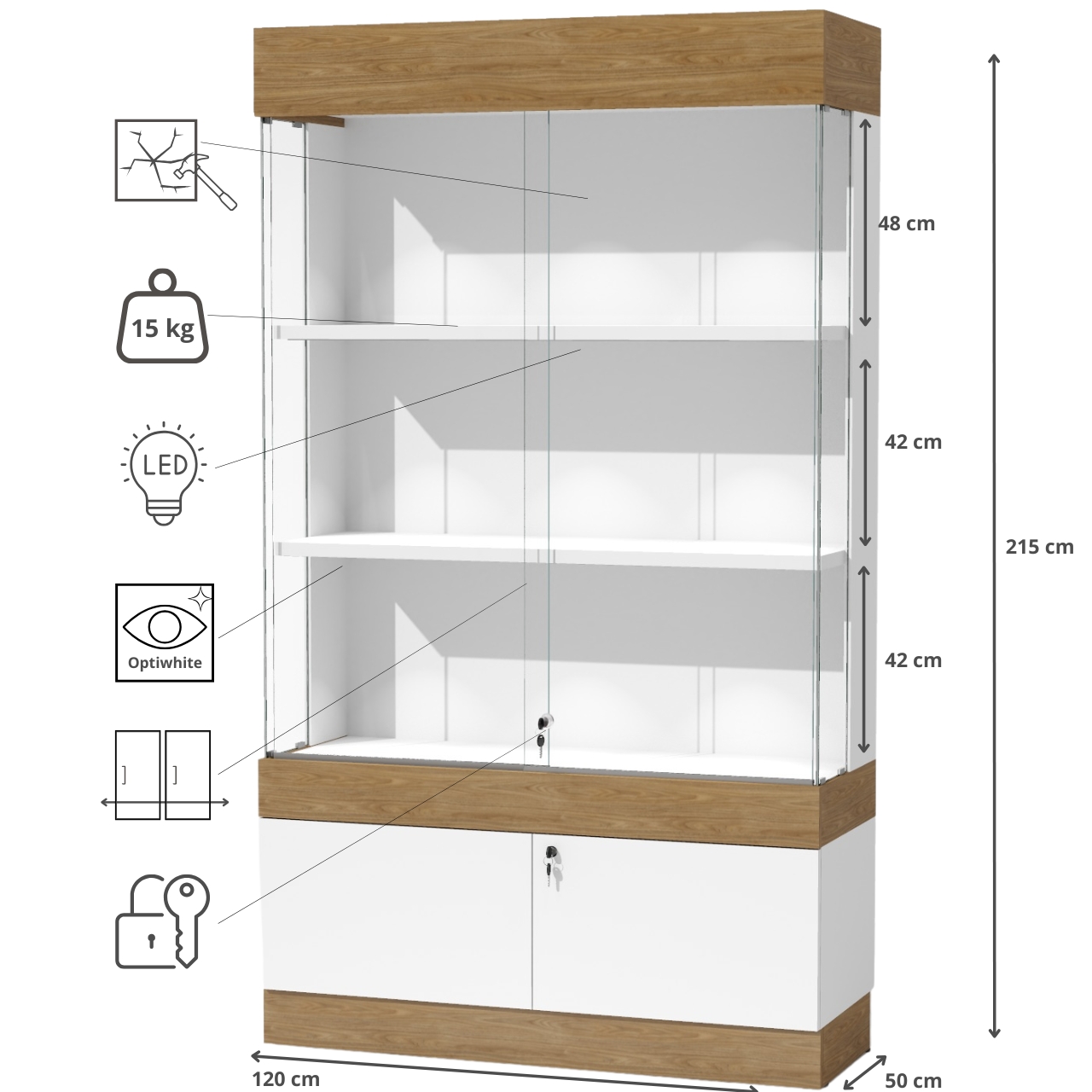 120 × 50 × 215 cm zapewnia większą powierzchnię prezentacyjną, co pozwala na czytelne i uporządkowane wyeksponowanie szerszego asortymentu.