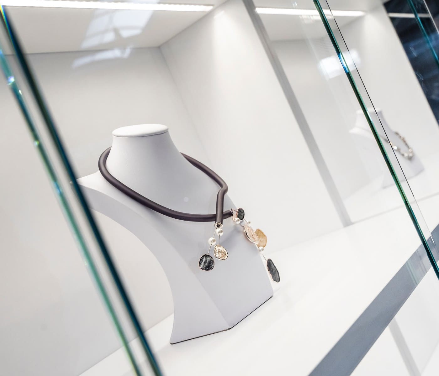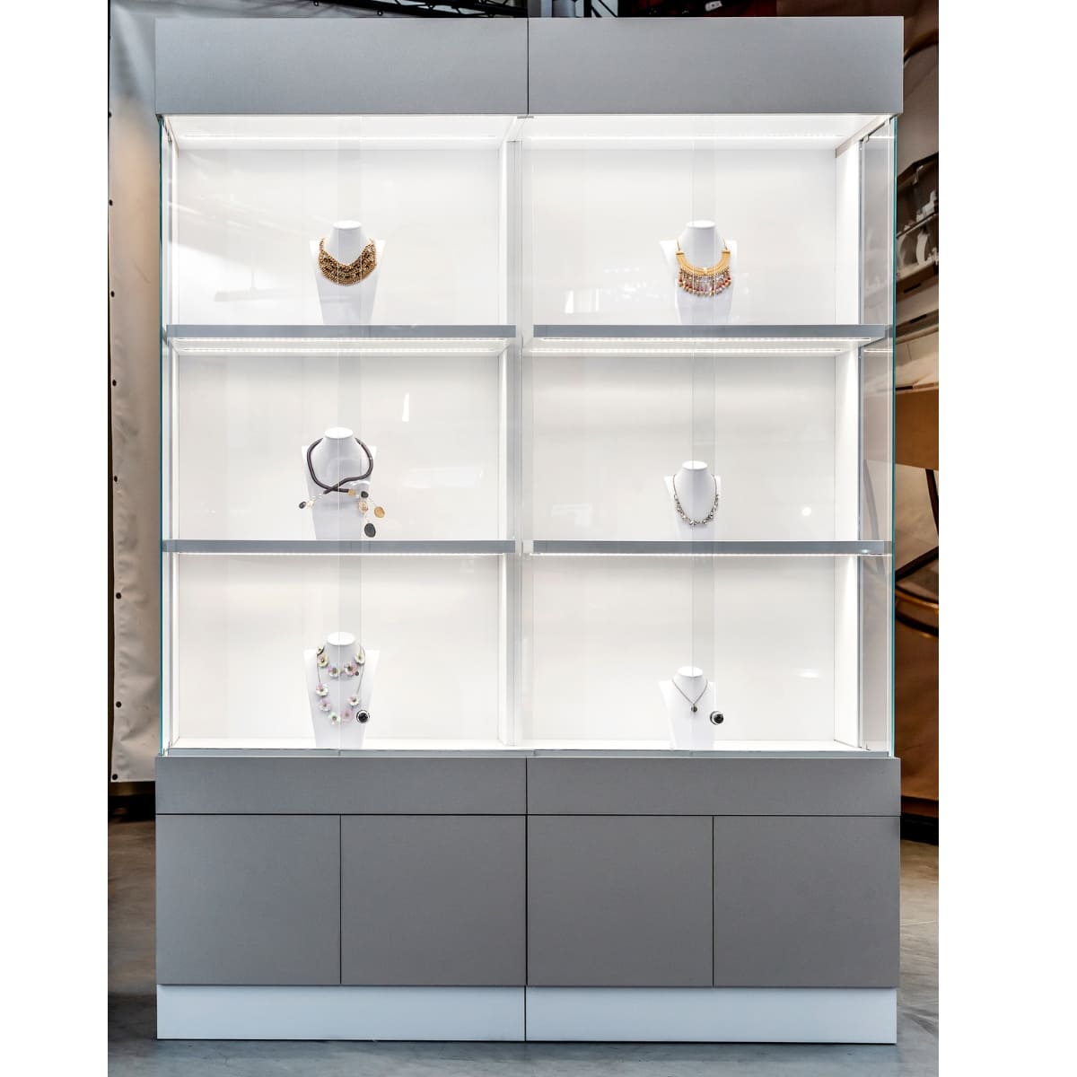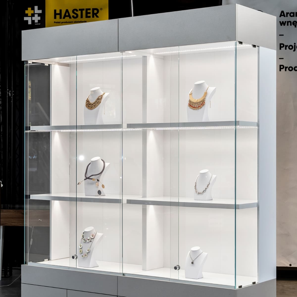 Wykonana z włoskiej płyty Cleaf FB80 Idea i szkła OPTIWHITE, zapewnia naturalne odwzorowanie kolorów oraz luksusowy wygląd ekspozycji. Drzwi przesuwne ułatwiają dostęp do biżuterii, oszczędzając przestrzeń przed witryną. Profesjonalne oświetlenie LED HASTER, po dwa moduły na półkę, podkreśla detale i blask kamieni, zwiększając atrakcyjność prezentowanych produktów. Systemowa konstrukcja pozwala na rozbudowę o kolejne moduły i tworzenie spójnych ciągów ekspozycyjnych.