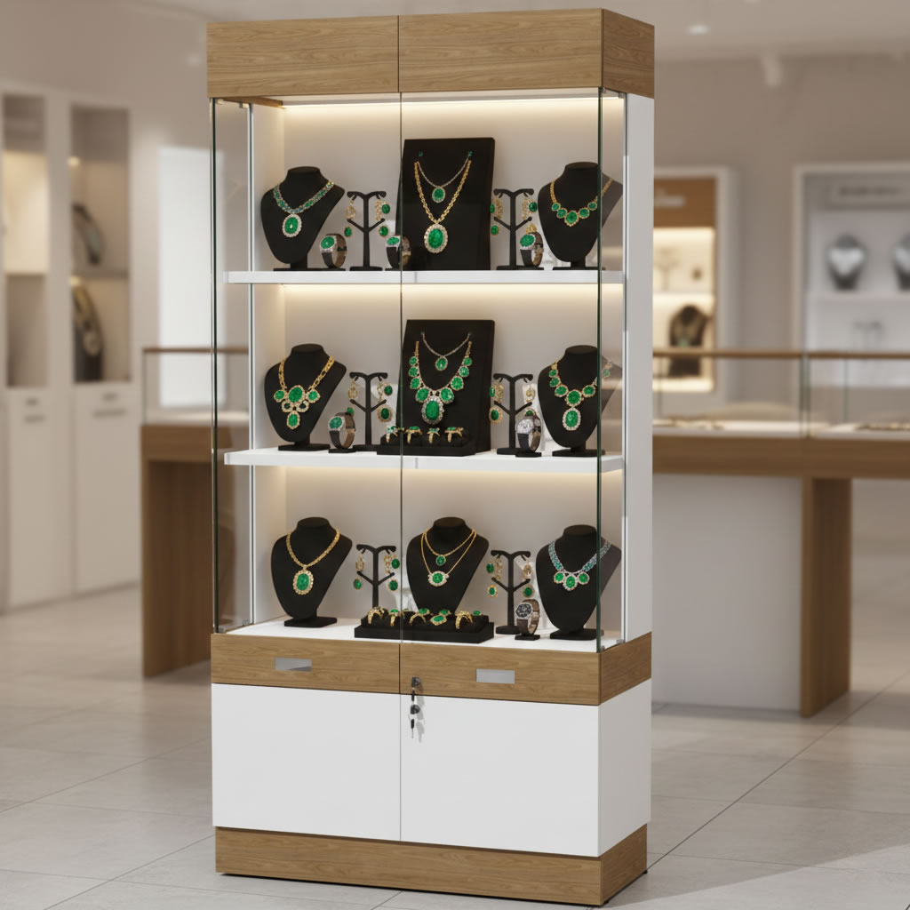 100 × 50 × 215 cm doskonale sprawdza się w salonach jubilerskich, butikach oraz przestrzeniach handlowych, gdzie liczy się elegancka forma i funkcjonalność mebli sklepowych.