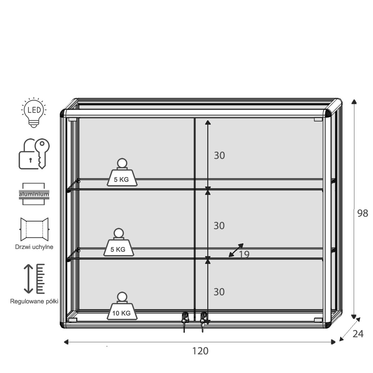 Wymiary: 120 × 24 × 98 cm – Większa szerokość umożliwia prezentację większej liczby eksponatów bez zajmowania miejsca na podłodze.