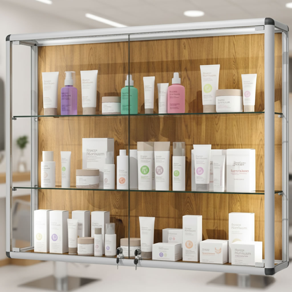Boki i drzwi wykonane ze szkła 5 mm, półki ze szkła 6 mm (opcjonalnie szkło hartowane) – Wysoka wytrzymałość konstrukcji i bezpieczeństwo eksponowanych przedmiotów.
