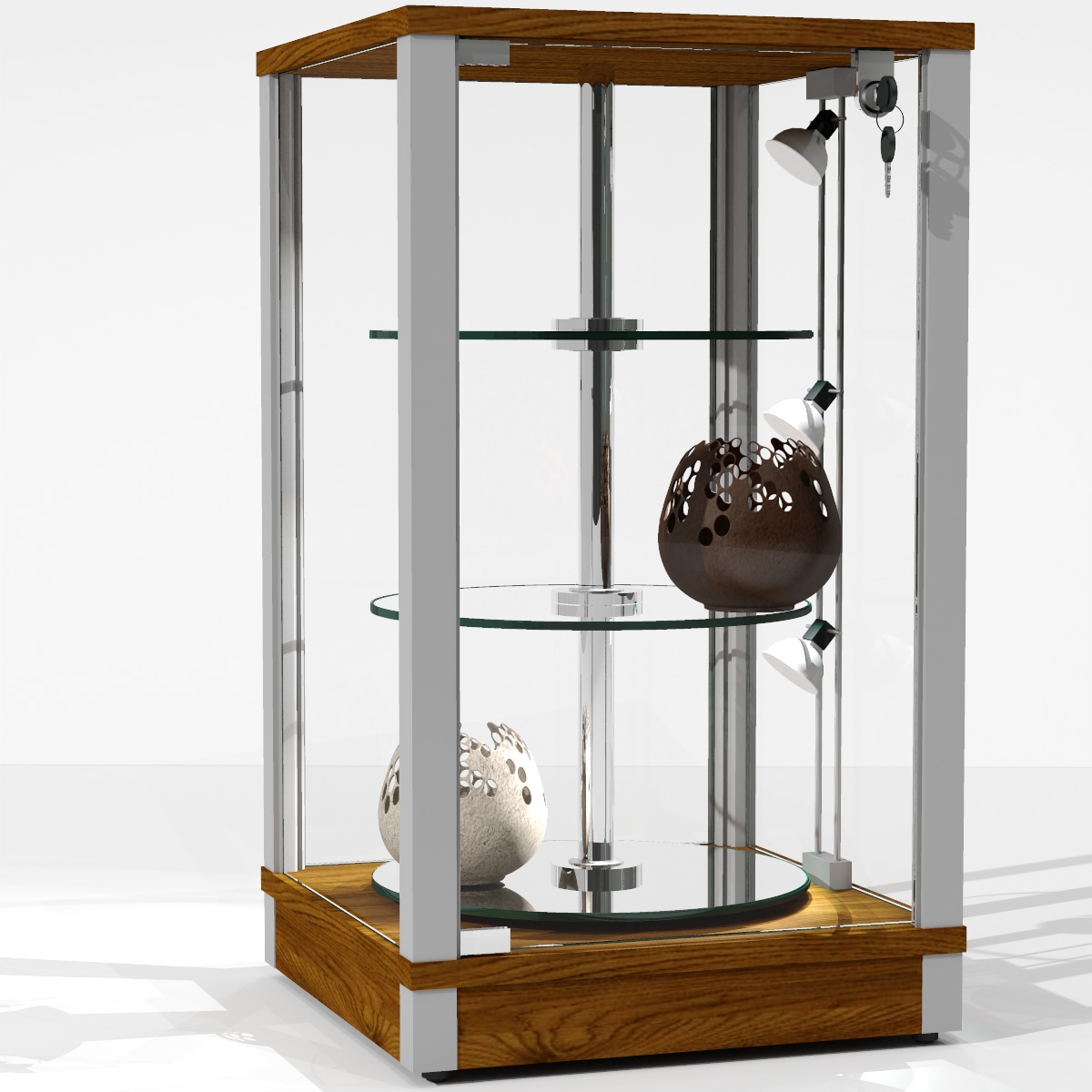 VARIO VA 10-OBR to stylowy i funkcjonalny mebel sklepowy oraz elegancka gablotka szklana, w pełni przeszklona i wyposażona w mechanizm obrotowy półek (1 obrót/min), który przyciąga uwagę i uatrakcyjnia prezentację. Szkło jest zabezpieczone gumowymi uszczelkami, chroniącymi przed kurzem, hałasem i drganiami. Regulowane półki pozwalają dostosować ekspozycję do charakteru eksponowanych przedmiotów, a opcjonalne oświetlenie LED (pionowe, boczne lub podpółkowe) podkreśla detale kolekcji. Gablotka jest dostarczana w całości złożona, zabezpieczona skrzynipaletą, co zapewnia pełne bezpieczeństwo szkła i gotowość do ustawienia od razu po dostawie.