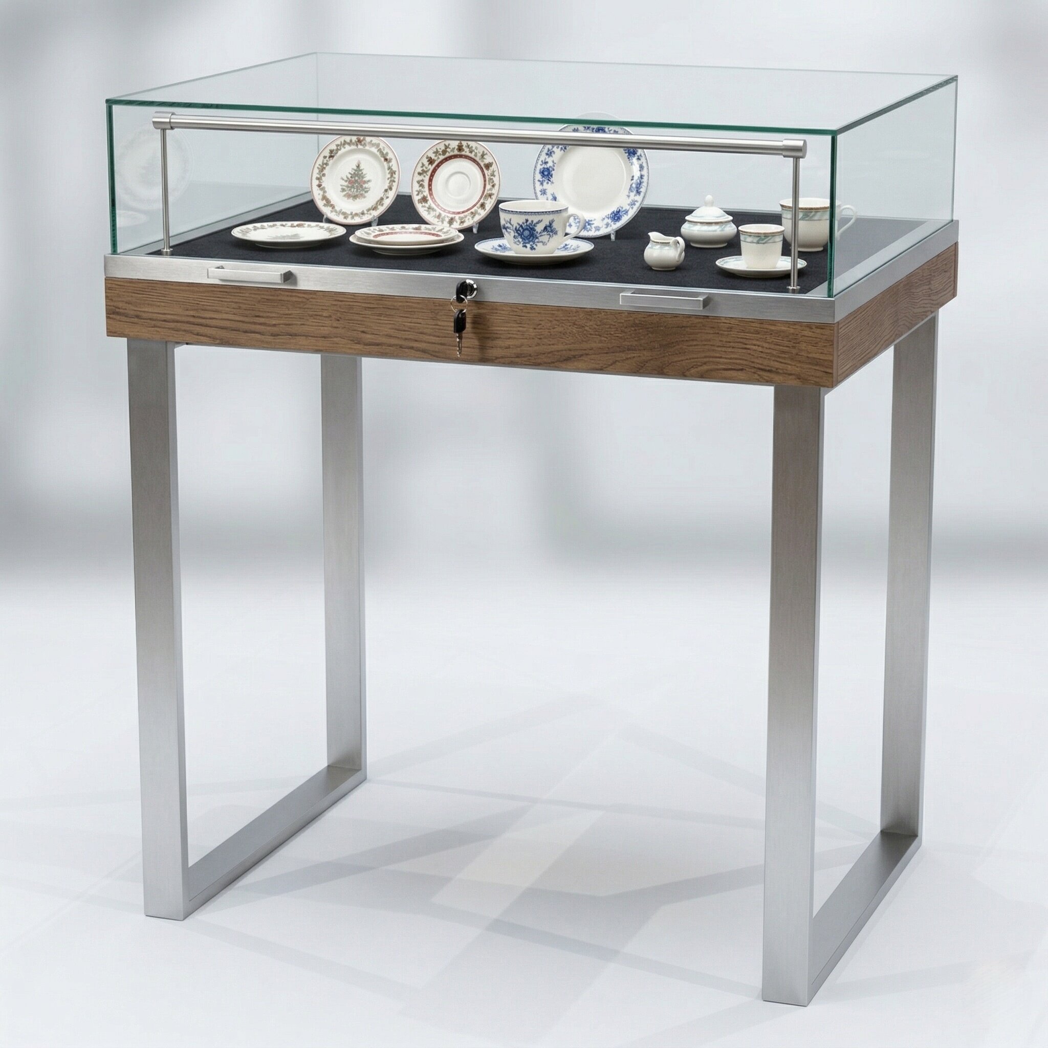 Górna część ekspozycyjna w formie szklanej kopuły zapewnia maksymalną widoczność prezentowanych obiektów. Szkło hartowane o grubości 6 mm, wykonane w technologii klejenia UV, gwarantuje trwałość oraz perfekcyjną estetykę bez widocznych łączeń.