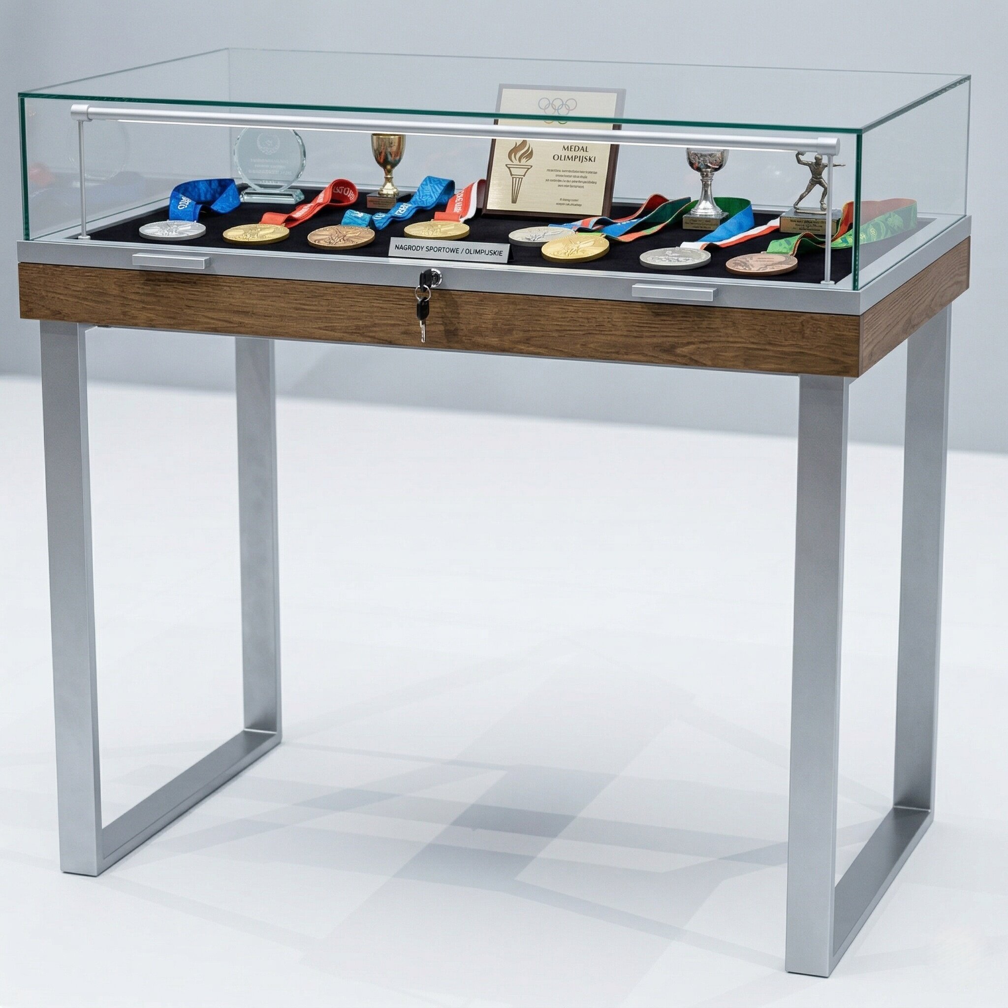 Górna część lady w formie przeszklonej kopuły zapewnia doskonałą widoczność prezentowanych obiektów. Szkło hartowane o grubości 6 mm, wykonane w technologii klejenia UV, gwarantuje trwałość oraz perfekcyjny efekt wizualny bez widocznych łączeń, co podkreśla profesjonalny charakter ekspozycji.