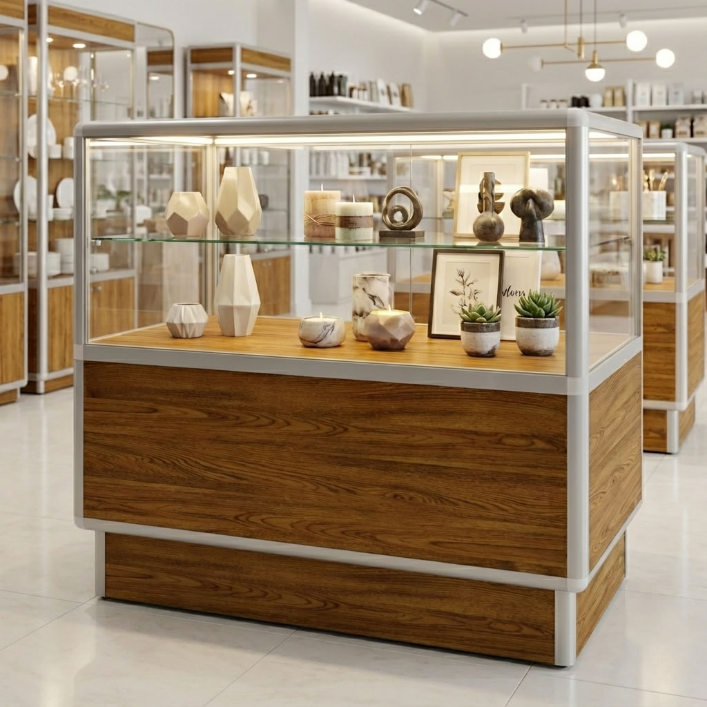 to funkcjonalny i estetyczny element wyposażenia sklepów, który łączy nowoczesną konstrukcję z trwałymi materiałami. Aluminiowy stelaż zapewnia stabilność i długą żywotność, a płyta laminowana o grubości 18 mm dostępna w wielu dekorach pozwala dopasować ladę do charakteru wnętrza. Przeszklona część ekspozycyjna umożliwia atrakcyjną prezentację towaru, a regulowane półki zwiększają elastyczność użytkowania. Dzięki kompaktowym wymiarom lada sprawdzi się zarówno w mniejszych, jak i większych punktach sprzedaży, zapewniając wygodną obsługę klienta i profesjonalny wygląd strefy sprzedaży.