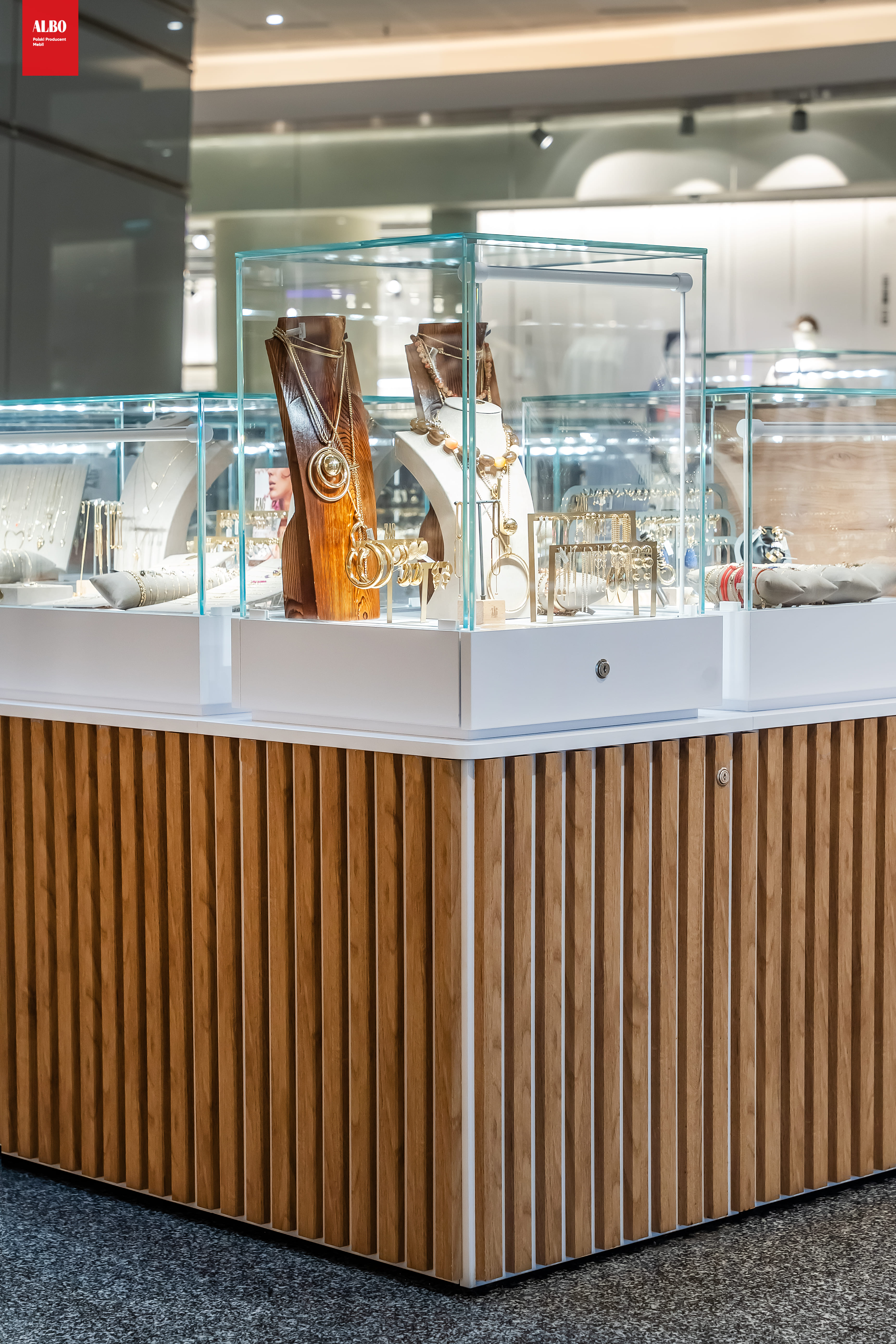 W tej realizacji zaprojektowaliśmy i wykonaliśmy elegancką wyspę handlową w centrum Złote Tarasy w Warszawie. Przemyślana konstrukcja pozwoliła na maksymalne wykorzystanie miejsca magazynowego, co było kluczowe w ograniczonej przestrzeni. Szklane kopuły z oświetleniem LED umieszczone na ladzie przyciągają wzrok klientów, a zastosowanie profesjonalnego oświetlenia HASTER podkreśla detale biżuterii, wydobywając jej naturalny blask. Szklane nadstawki umożliwiają obsługę klientów bez wychodzenia zza wyspy handlowej, zwiększając komfort i bezpieczeństwo zarówno sprzedawców, jak i klientów. Stoisko handlowe z lamelami pełni jednocześnie funkcję lady sklepowej z nadstawką, tworząc kompletne rozwiązanie na bardzo małej powierzchni. Każdy element wyspy został zaprojektowany tak, aby spełnić wszystkie potrzeby funkcjonalne i estetyczne, zapewniając wyjątkową prezentację biżuterii i komfort zakupów.
