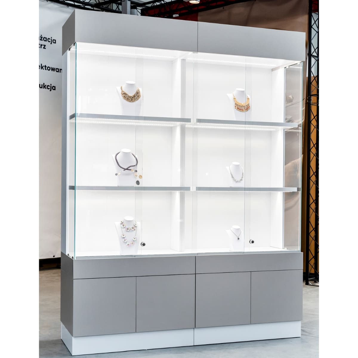 - Punkty usługowe i biura – funkcjonalne meble sklepowe ułatwiają organizację przestrzeni, a szklane gabloty i witryny prezentują produkty czy dokumenty w profesjonalny sposób.