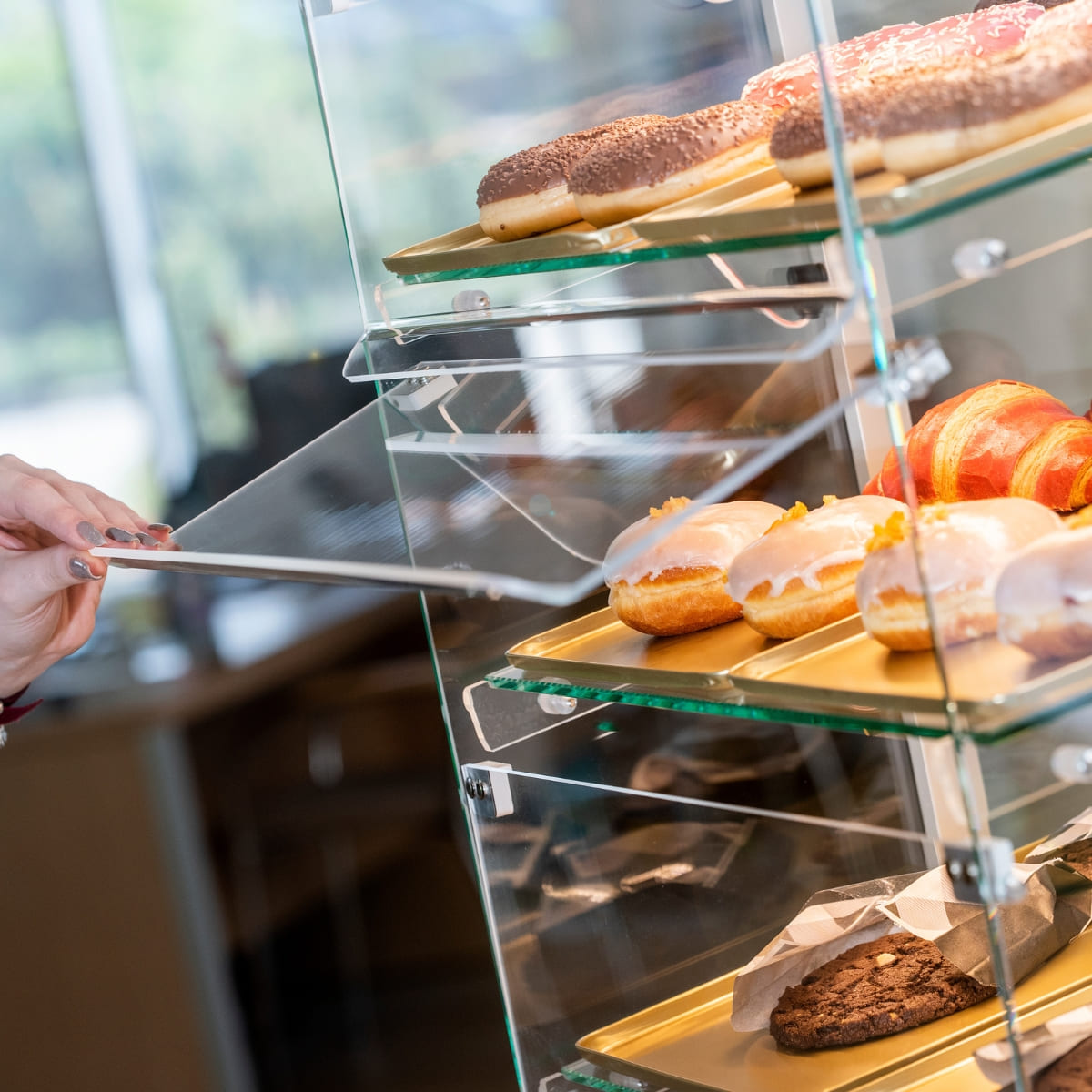 W witrynie SNACK zamontowano oświetlenie podpółkowe LED o ciepłej barwie 3000K. Takie oświetlenie podkreśla świeżość i apetyczny wygląd wypieków, zwiększając ich atrakcyjność dla klientów. Moduł LED charakteryzuje się wysokim współczynnikiem oddawania barw (CRI), co zapewnia naturalne odwzorowanie kolorów produktów.