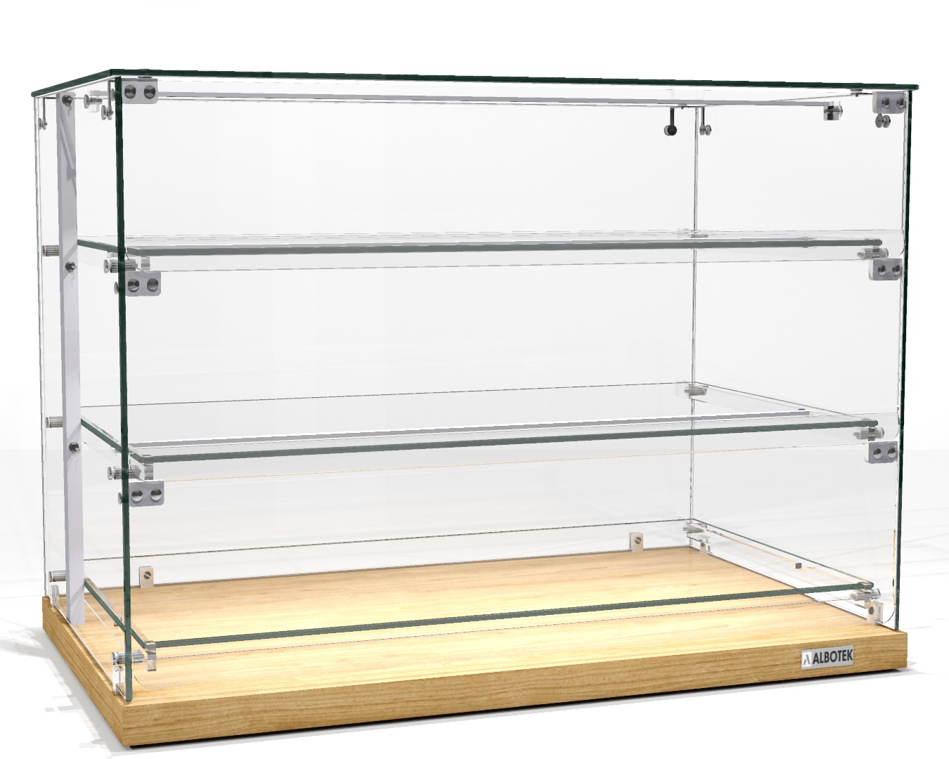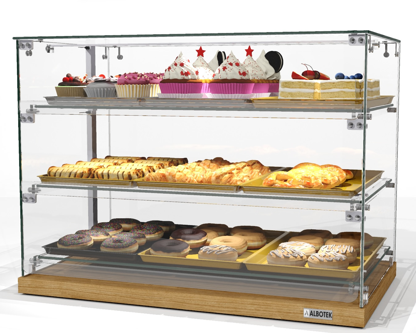 Przeszklone ściany i półki pozwalają na atrakcyjną prezentację ciast, ciastek, kanapek i przekąsek, zachęcając klientów do zakupu. Model wyposażony jest w praktyczne klapki umożliwiające łatwy dostęp do produktów od strony obsługi, co przekłada się na sprawną i komfortową obsługę klientów.