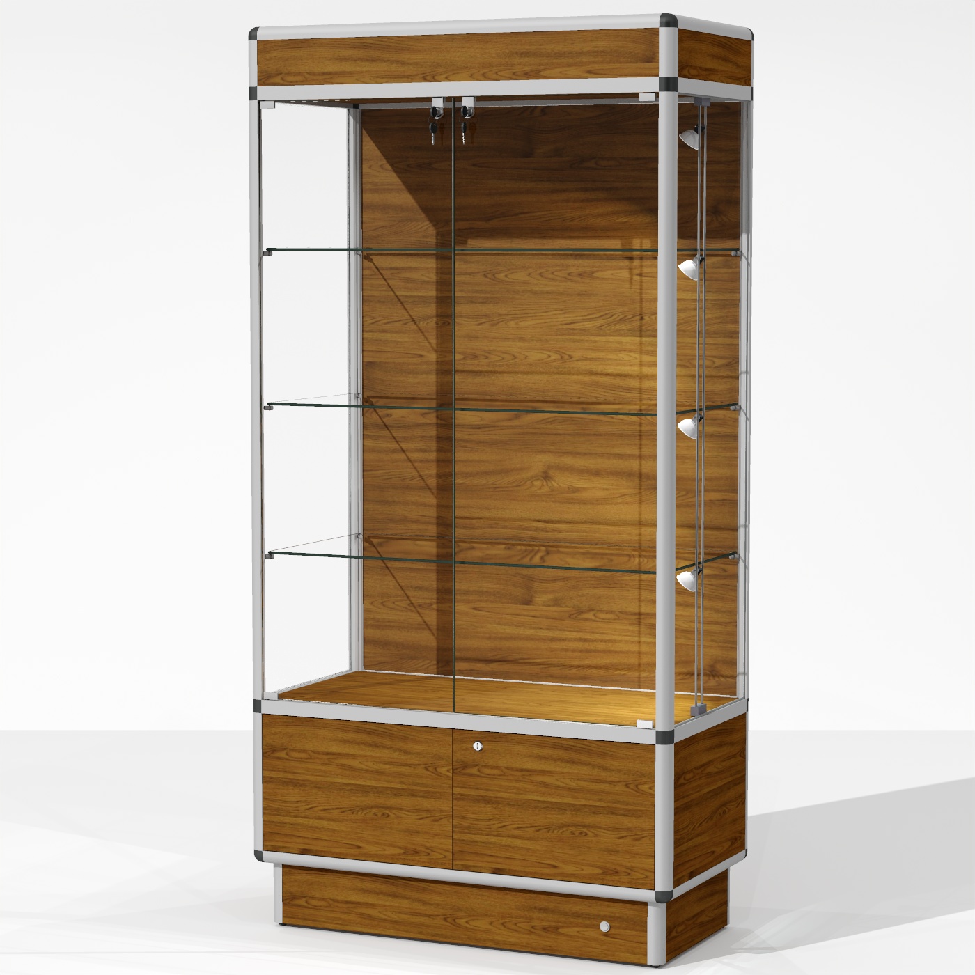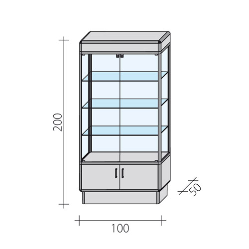 Dolna szafka pozwala przechowywać zapasowe materiały, co czyni produkt zarówno ekspozycyjnym, jak i praktycznym.