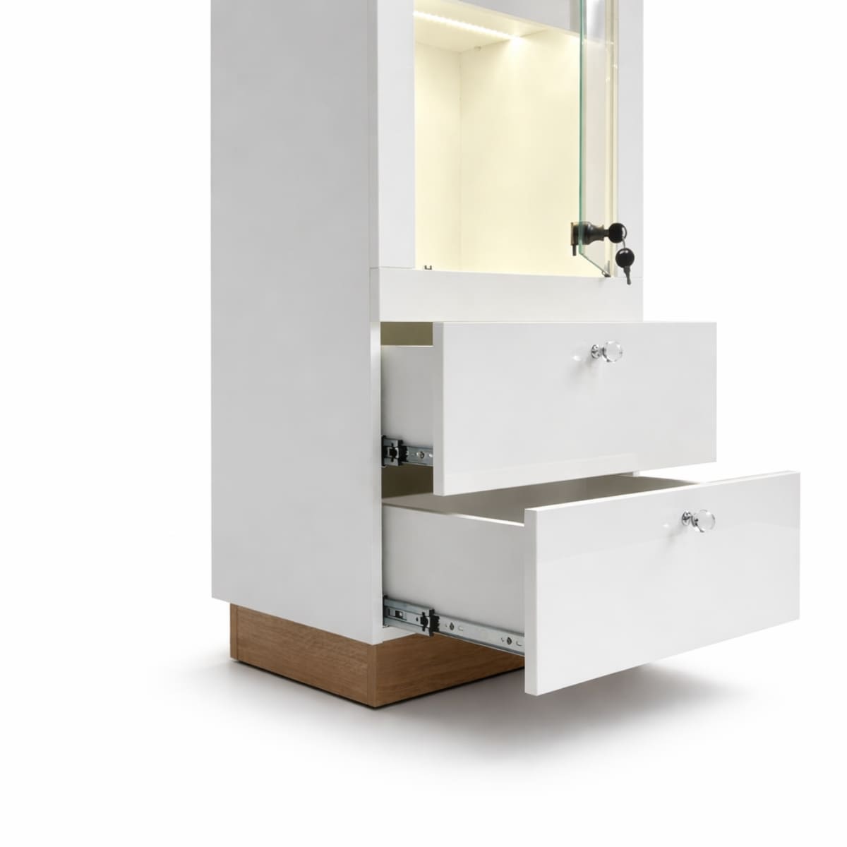 Nowoczesna witryna wystawiennicza szklana to idealne rozwiązanie do efektownej prezentacji produktów w przestrzeniach handlowych i wnętrzach premium. Biały front w wysokim połysku w połączeniu z przeszklonymi drzwiami zapewnia doskonałą ekspozycję oraz podkreśla ekskluzywny charakter prezentowanych przedmiotów.