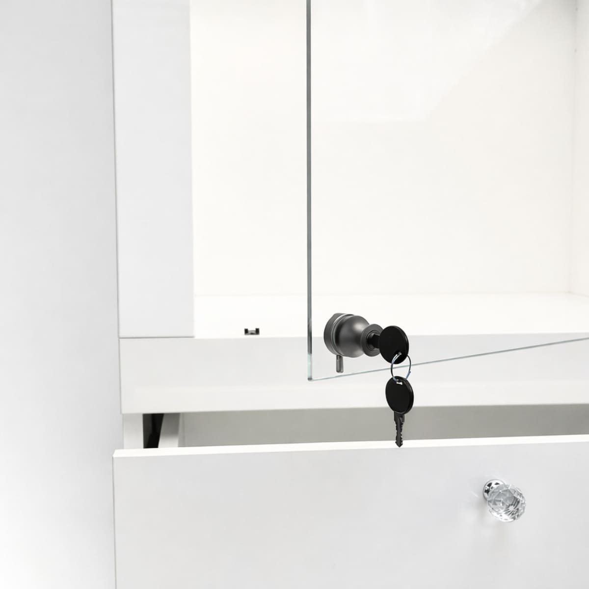 - W dolnej części dwie szuflady do przechowywania wyposażone w kryształowe uchwyty