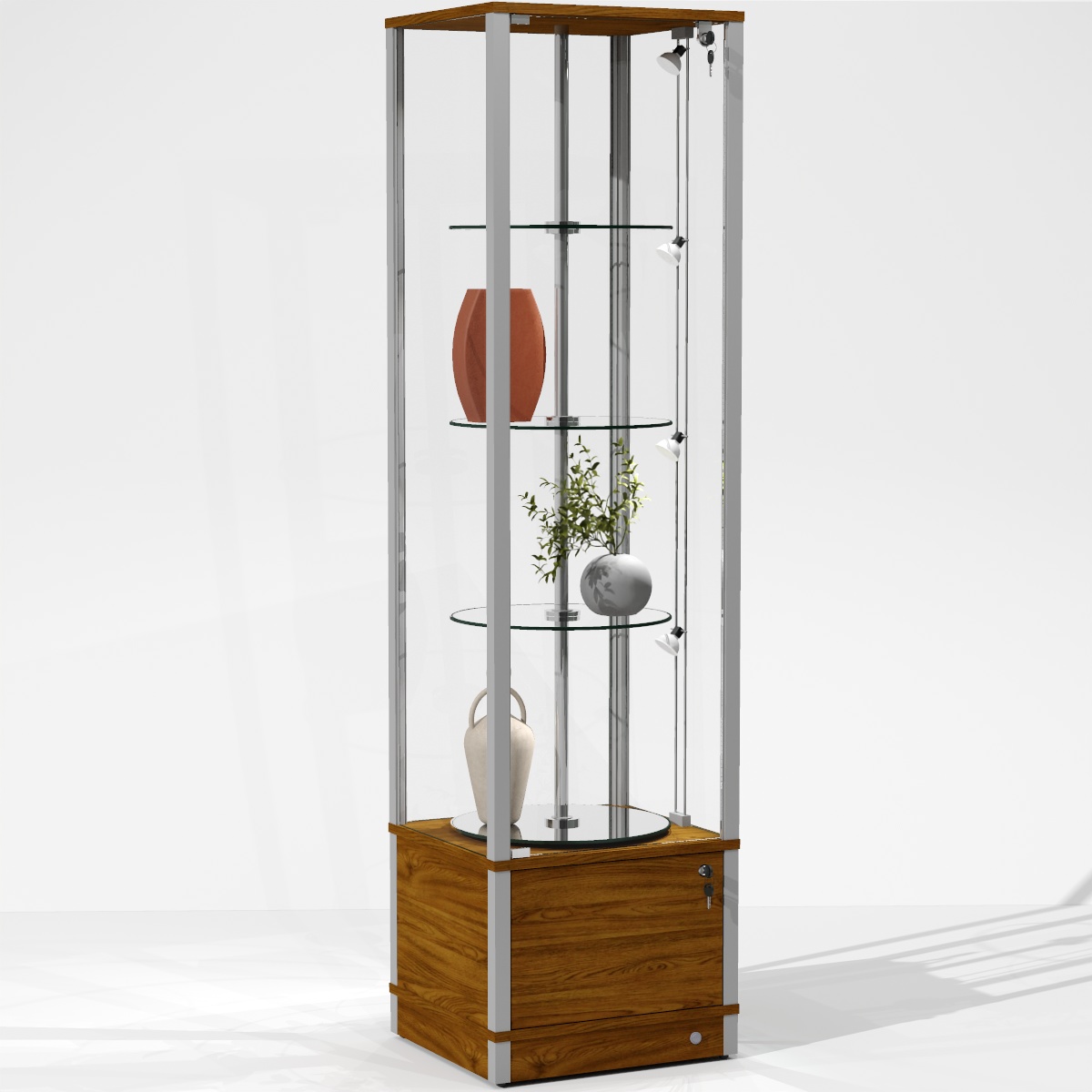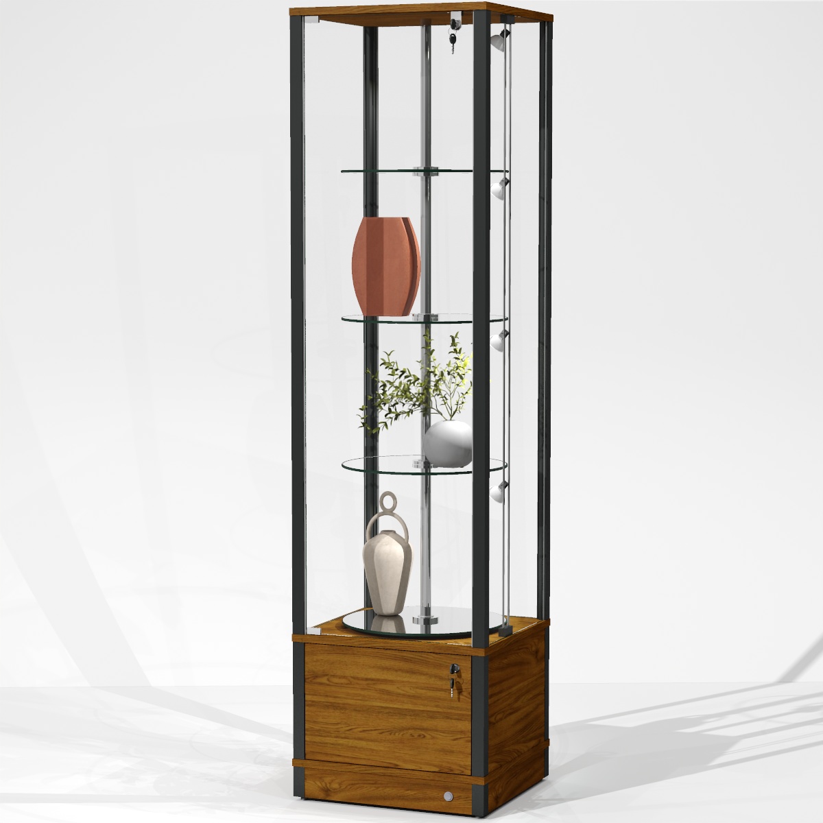 VARIO VA 2-D-OBR to prestiżowy mebel sklepowy i designerska gablota szklana, przeszklona z każdej strony i wyposażona w praktyczną dolną szafkę. Półki obracają się płynnie (1 obrót/min), co wyróżnia ekspozycję i przyciąga uwagę. Szkło jest starannie osadzone w gumowych uszczelkach, które chronią je przed kurzem, hałasem i drganiami. Regulowane półki dają dużą elastyczność aranżacji wystawy, a możliwość zamontowania oświetlenia LED (boczne lub podpółkowe) dodatkowo podkreśla detale eksponatów. Mebel dostarczany jest w gotowej formie, zabezpieczony skrzynipaletą, co gwarantuje bezpieczny transport i natychmiastową gotowość do ekspozycji.